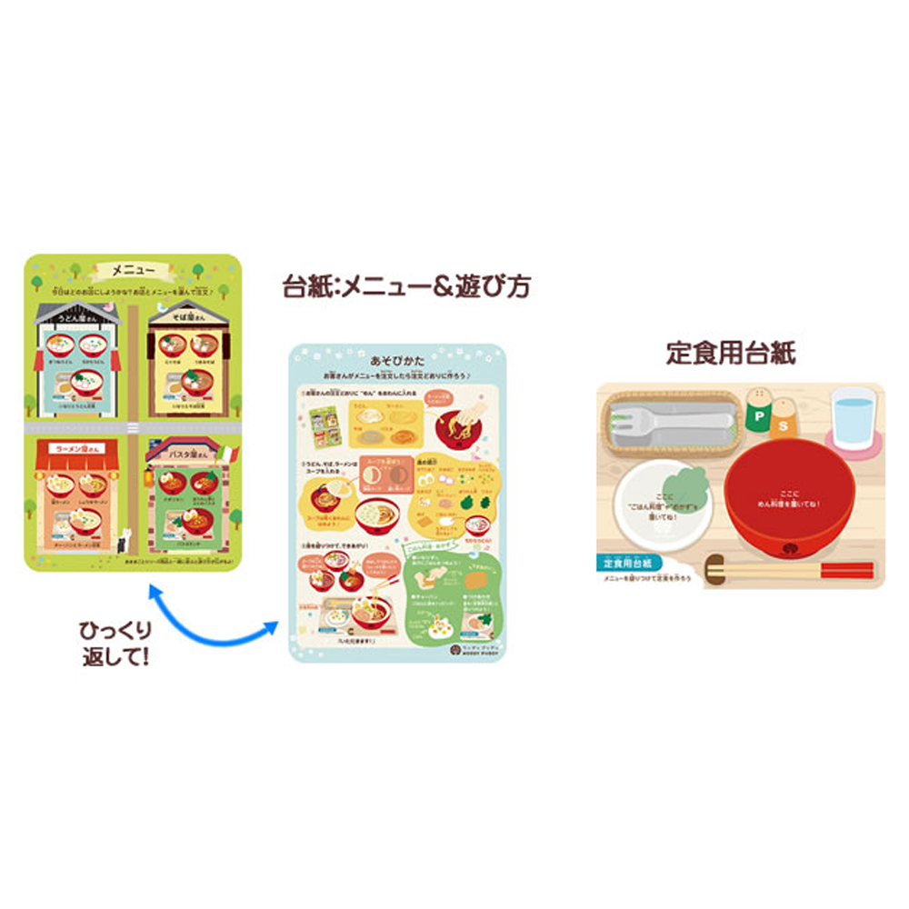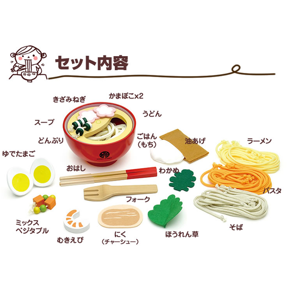 ■ 内容:どんぶりx1、スープx1、おはしx1、フォークx1、うどん(10本)x1、そば(10本)x1、ラーメン(10本)x1、パスタ(10本)x1、かまぼこx2、きざみねぎx1、ゆでたまごx1、ミックスベジタブルx1、むきえびx1、にく(チャーシュー)x1、あげx1、ごはん(もち)x1、わかめx1、ほうれんそうx1、台紙x2