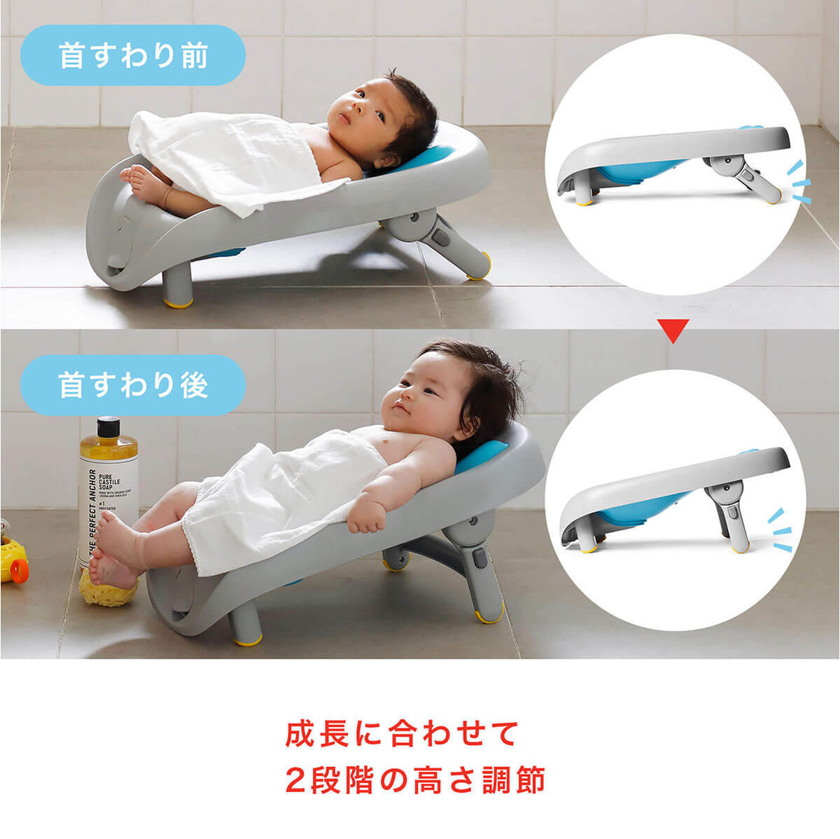 point.1沐浴バスからバスチェアに変身(2段階高さ調節)赤ちゃんの成長に合わせて高さ調節!パパママも両手が使えてお世話がラクラクpoint.2ソフト素材のシート(快適な座り心地)ひんやり感が少ないソフト素材のシートはお尻の部分にお湯がためられるから、赤ちゃんの体もポカポカ!