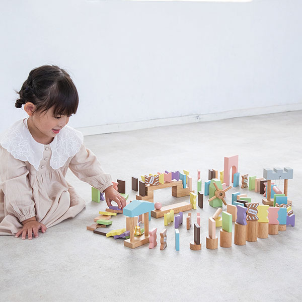 ■ セット内容:ブロック(長方形・キャンディ)×各40、円柱階段×8、風車・突き棒・ベル・アーチ・収納袋×各1、方向転換(土台・棒×各1)、ボールころがし(ボール・板×各1)階段セット(階段×2、板×1)